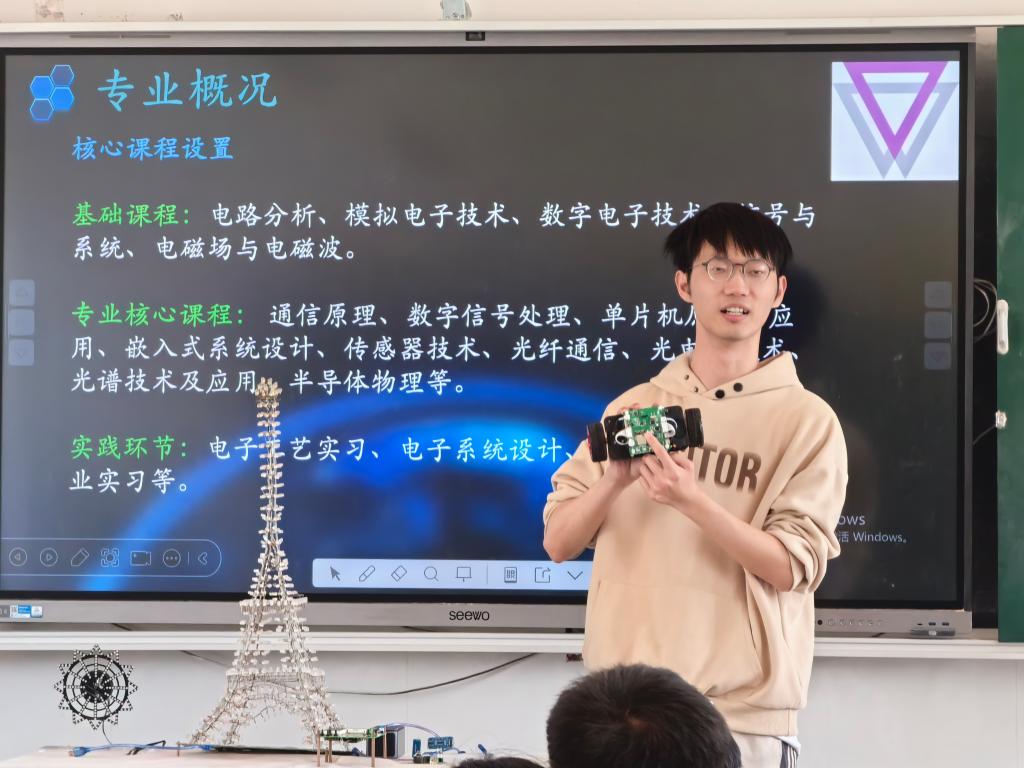 聂宇轩分享了学校五星级社团——梦创电子协会在电子创新竞赛中攻坚克难、屡获佳绩的故事,通过智能小车、LED 灯控系统等作品演示,让“科技领航创新”的理念具象化,激发学生创新实践热情。
